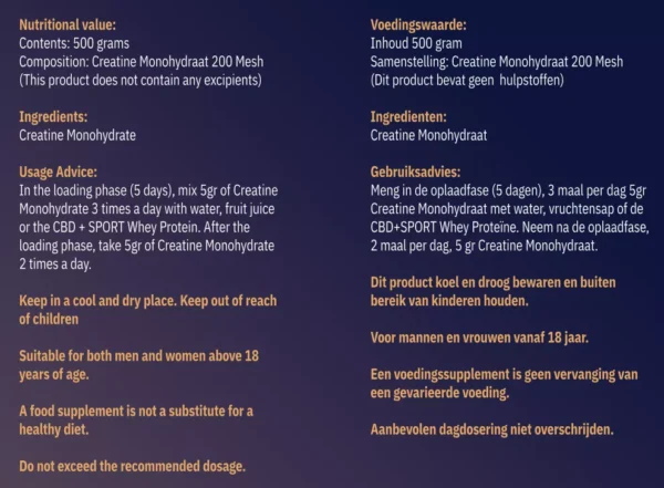 During the loading phase, mix a 3 gram dose of creatine monohydrate with fruit juice, water or CBD + SPORT Whey Protein 5 times a day. After this phase you can switch to the maintenance dose: a dose of 5 grams of creatine monohydrate twice a day. In addition, the pot weighs 500 grams. You can get about 100 doses from this.
